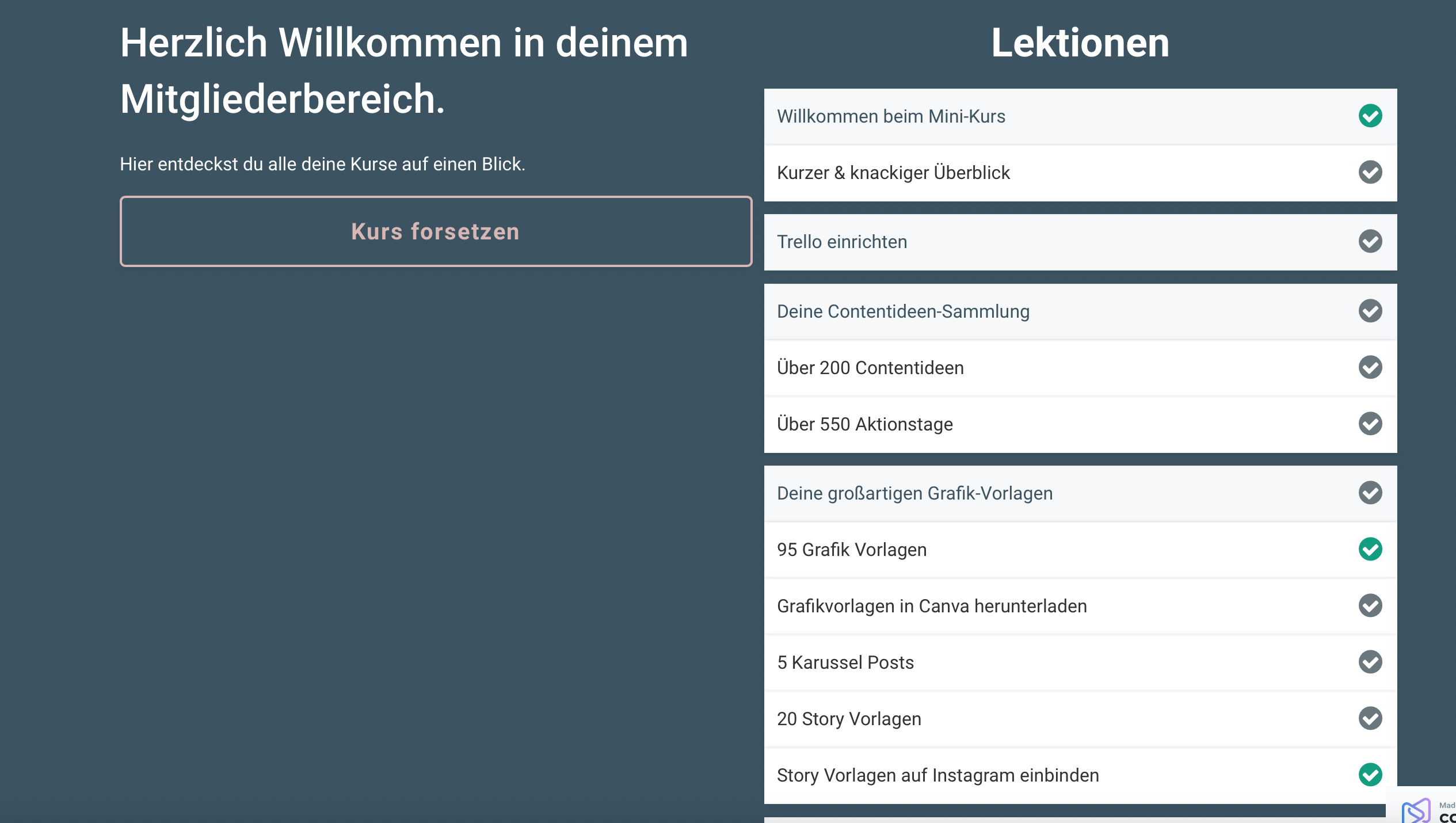 Auf der rechten Seite siehst du schon einmal einen ersten Einblick in deinen Mitgliederbereich.